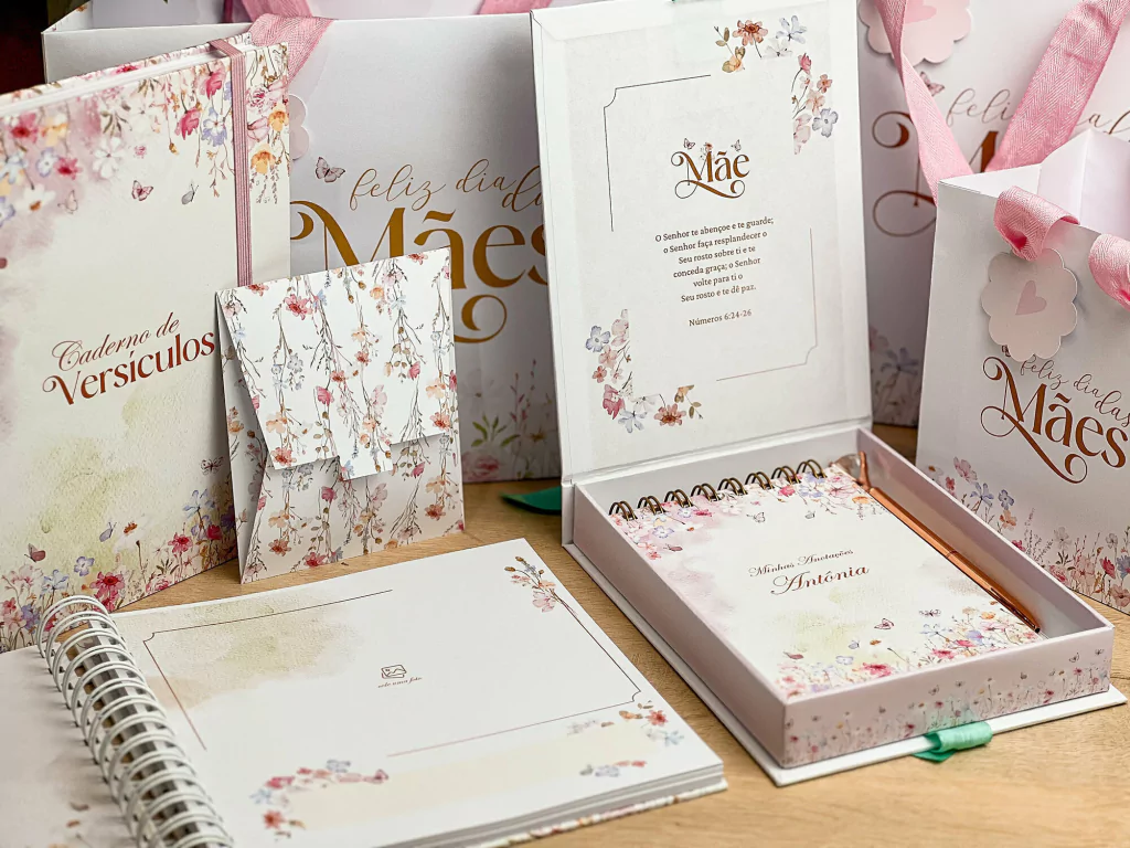 - Cadernos A5 versículos ( em 04 modelos de miolo, entre a pág neutra e floral, com 200 pág e cada pág um Versículos Bíblicos)
