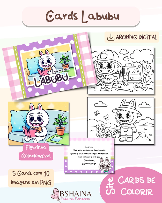 A tendência dos cards para colorir está ainda mais fofa com o monstrinho mais querido do momento: Labubu! Este produto reúne diversão, criatividade e colecionabilidade em um formato prático e encantador — ideal para montar kits personalizados, usar como lembrancinha ou simplesmente relaxar colorindo.