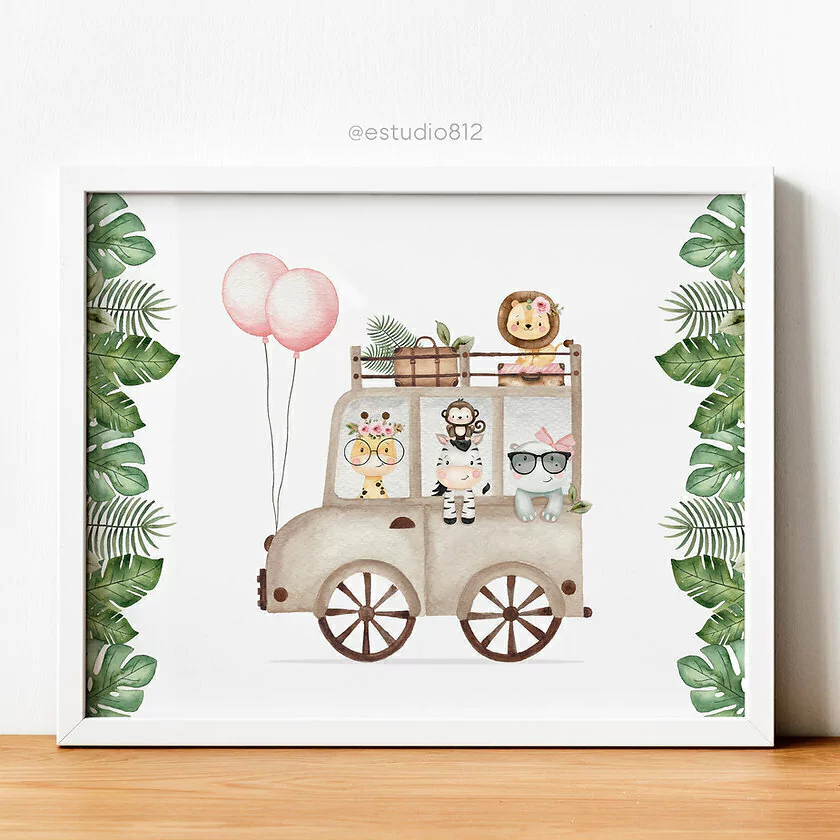 safari, candycolor, meninas, flores, zebra, tigre, macaco, carro, leão, balões, girafa