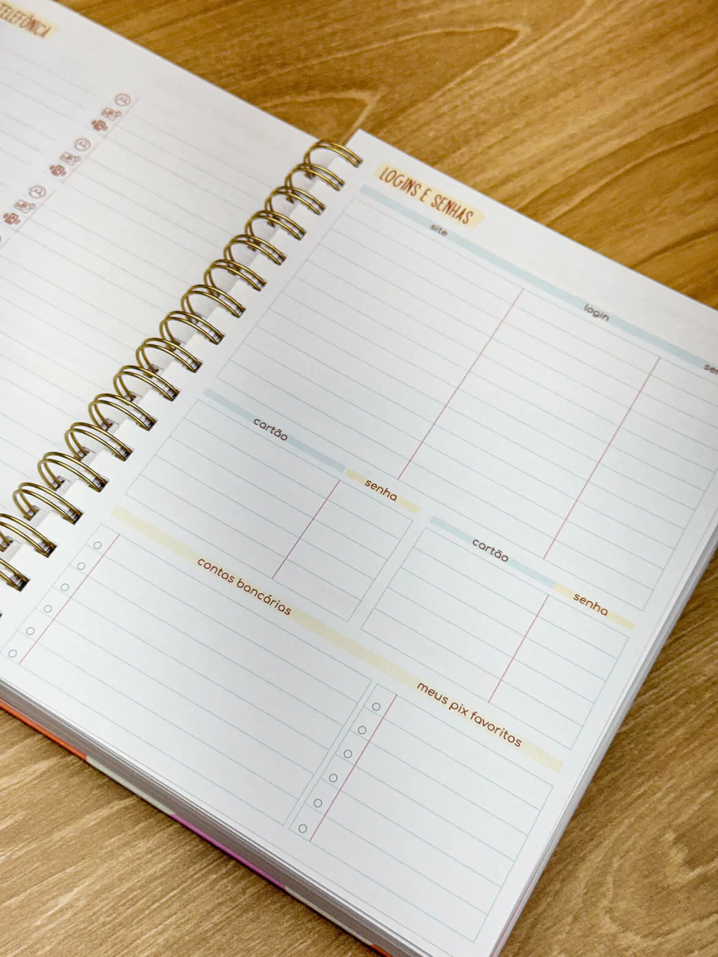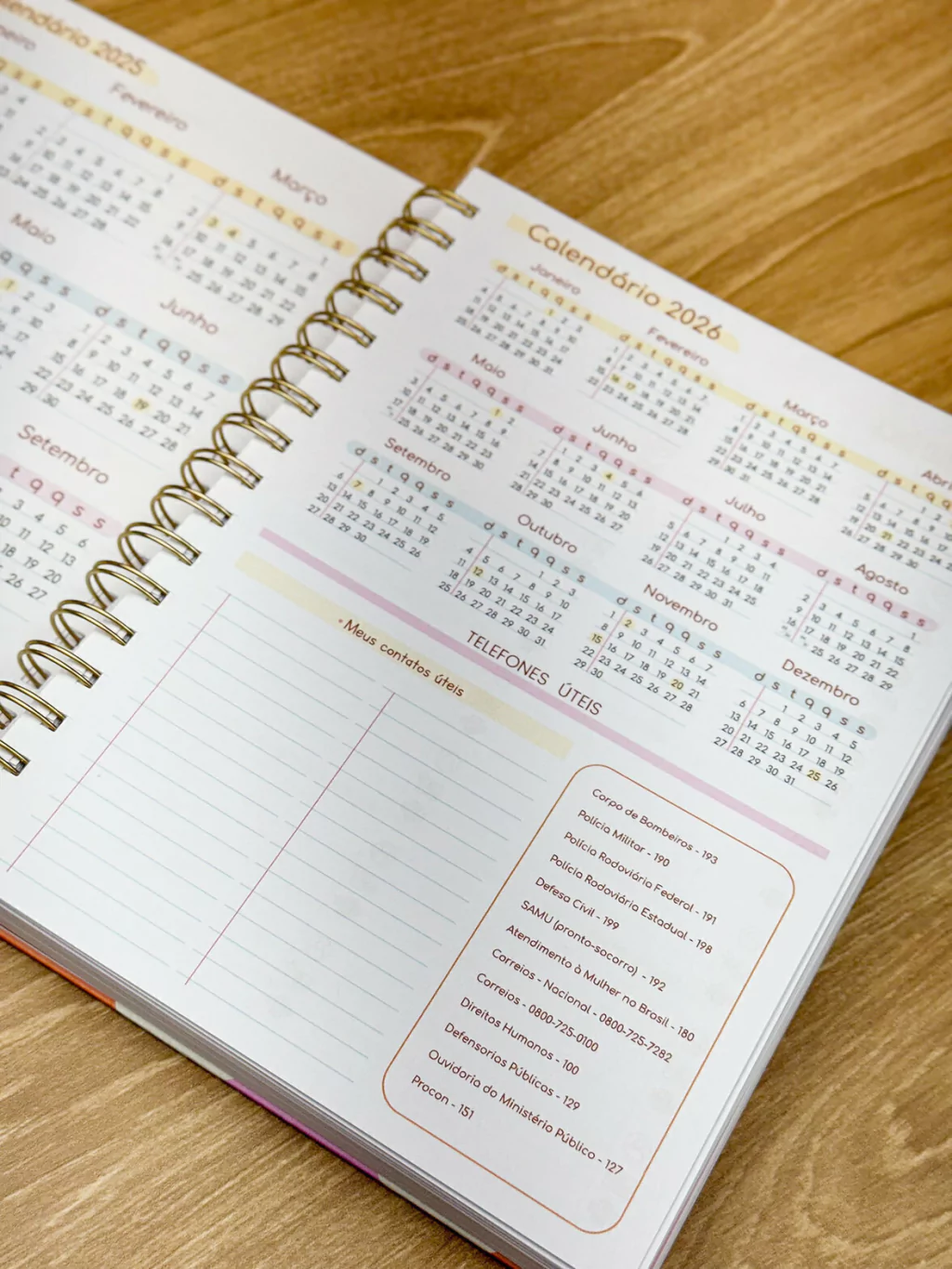 Pág de dados, calendário 25-26, lista telefonica, logins e senhas, controle de saúde, planejamento anual, metas do ano e planejamento mensal e semanal com marcação do dia da semana e controle financeiro DE JANEIRO A DEZEMBRO.