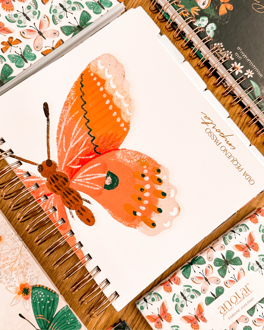 Os blocos possuem versão com fundo rosa, verde, branco. Todos com ilustração de borboletas