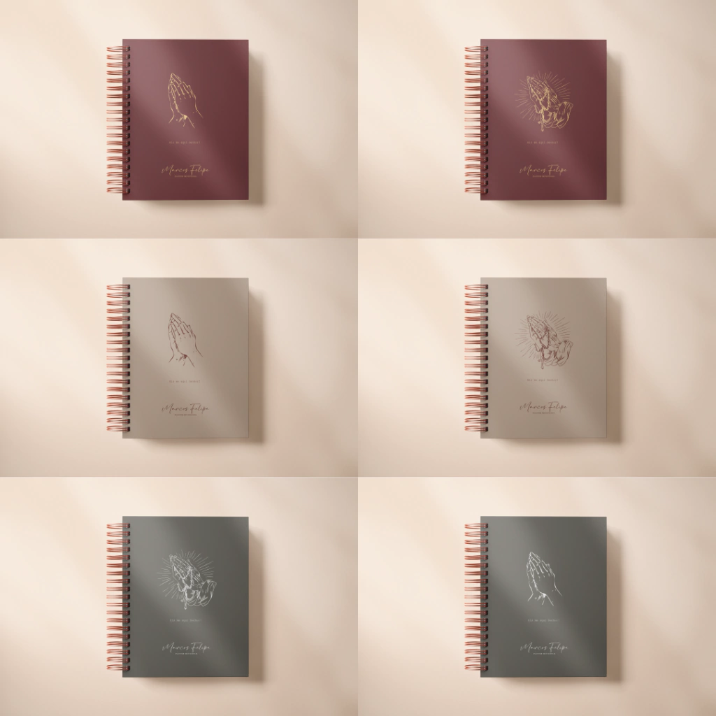 Modelos em tons escuros com dois desenhos simbolizando a oração católica e outra a evangelica.